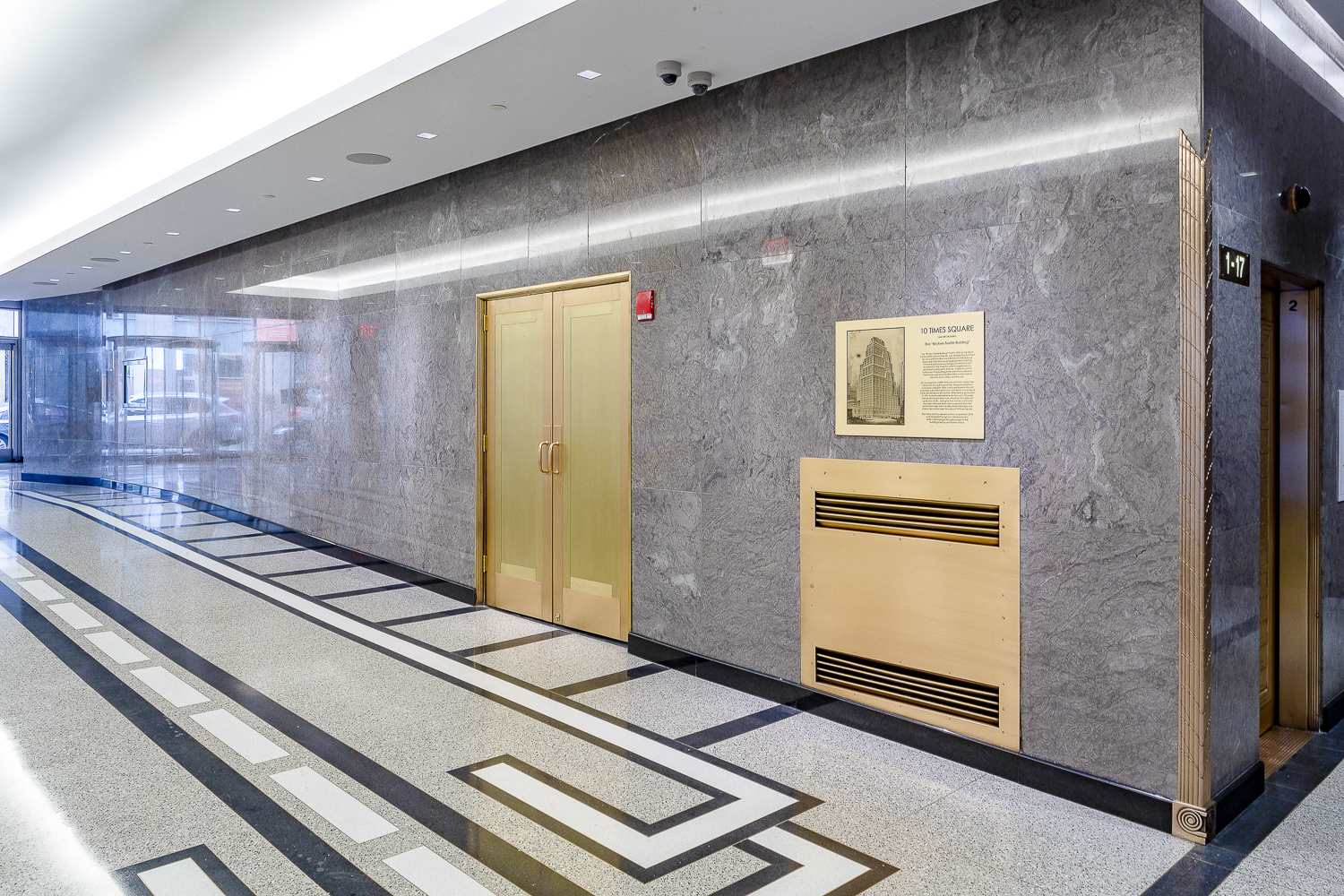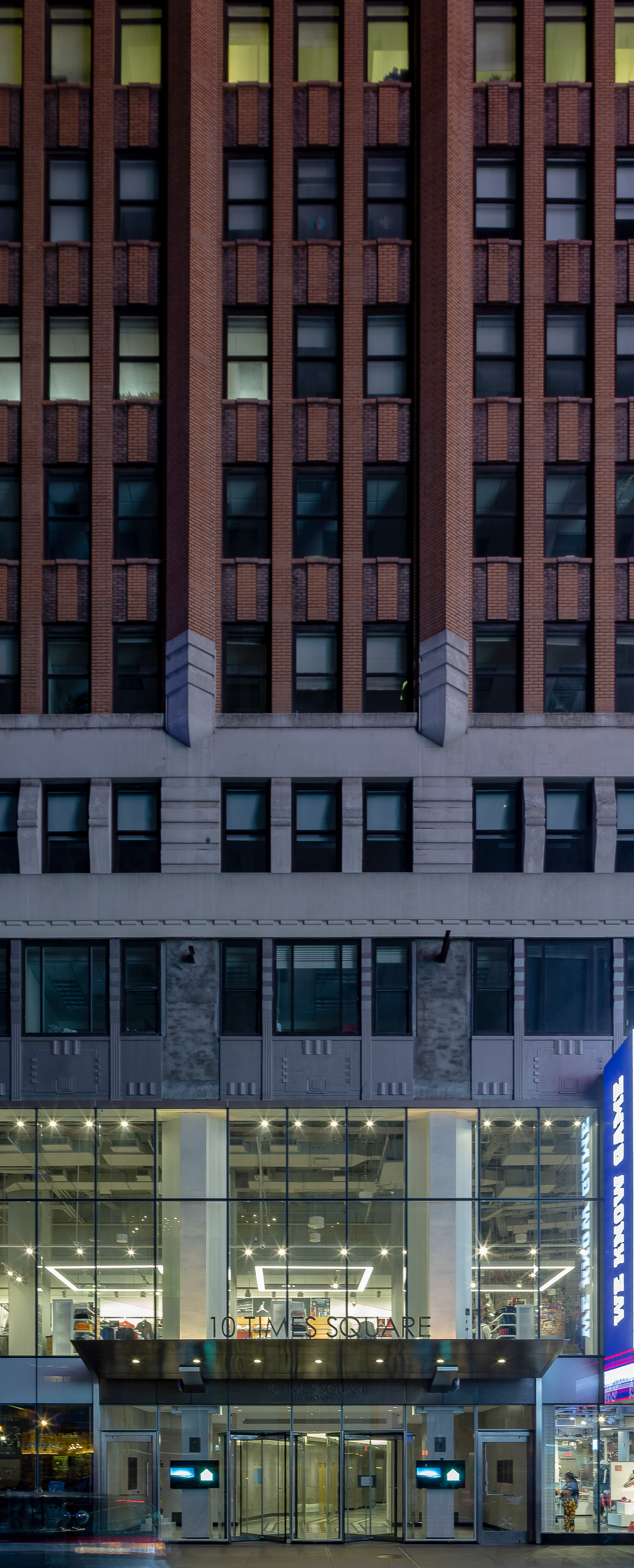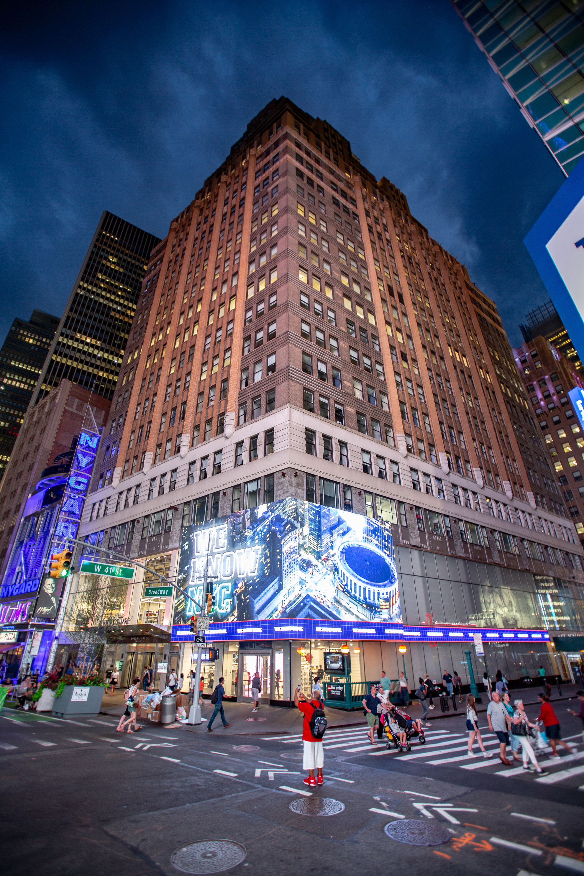Designed by Bachman & Kahn, the building was completed in 1930 and originally known as the “Bricken Textile Building”. The building has numerous setbacks and floor sizes range from 22,00sf in the base to 5,500sf in the high-rise. In 2018, a major lobby renovation was completed featuring elements of the old building mended with new age materials including state of the art video and sound elements that bring art and commerce together in a unique setting. The renovation also created a new “glass box” retail offering which features nearly 46,000 square feet of prime retail space comprising the first, second, and lower level of the building with notably high ceiling heights at each level. Major tenants include: One Jeanswear Group, Inc., Times Square Suites, and Champs/Footlocker.